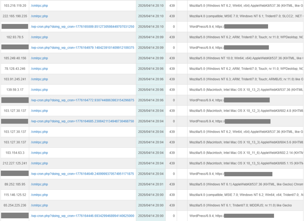 • アクセスログに、xmlrpc.phpへのアクセスが多数見受けられます。