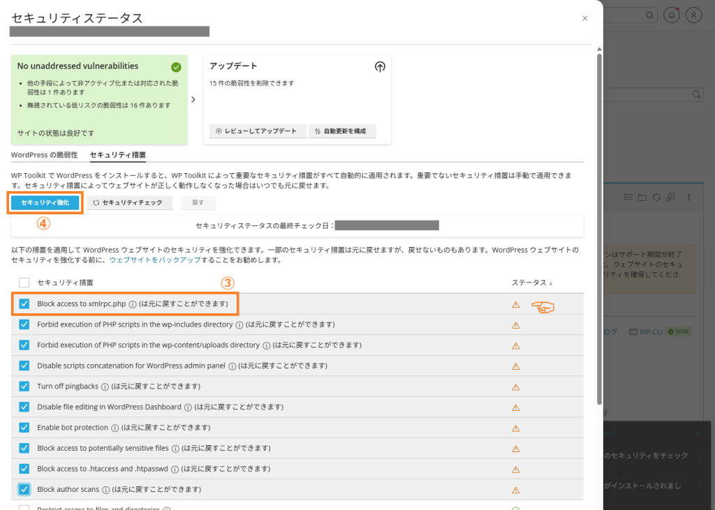 対策したい項目をチェックで選択し、「セキュリティ強化」ボタンをクリックします。