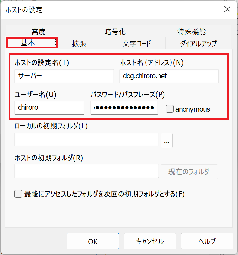 ホストの設定画面が開きますので、【アカウント設定完了のお知らせ】に記載されている情報を入力します。