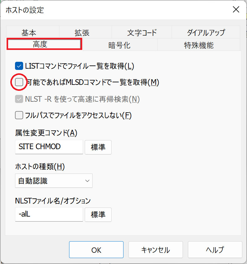 可能であればMLSDコマンドで一覧を取得 | チェックを外します |